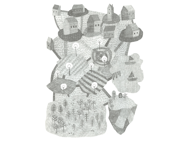 • Ilustração a preto e branco de casas, árvores e pequenas criaturas num cenário fantástico.
