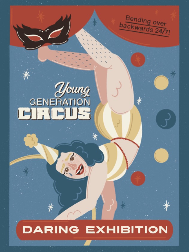 • Cartaz colorido de circo com contorcionista e texto promocional