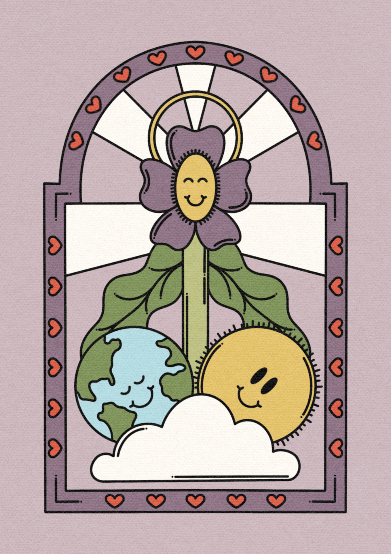 • Ilustração colorida de flor, planeta Terra, sol sorridente e nuvem dentro de moldura em arco com corações