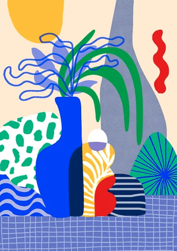 • Ilustração colorida de vaso azul com folhas verdes sobre padrão quadriculado azul e várias formas geométricas coloridas.