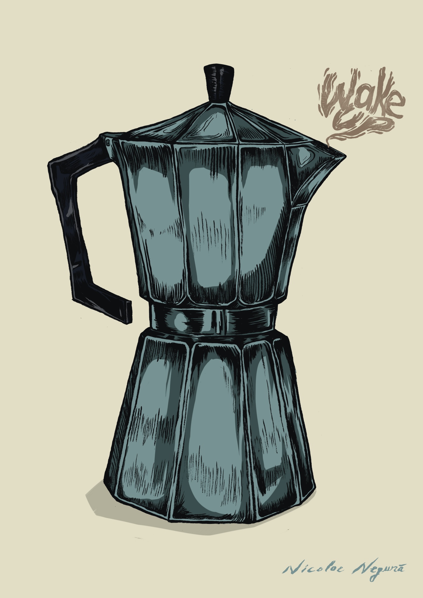 • Ilustração de uma cafeteira italiana cinzenta com alça preta e texto 'awake' no fundo bege