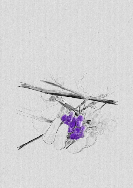 • Desenho de mão segurando cacho de uvas roxas sobre fundo cinzento