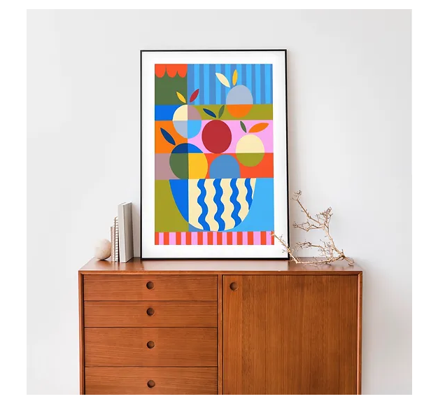• Ilustração colorida abstrata em moldura preta sobre móvel de madeira com livros e ramo seco