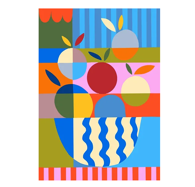 • Pôster geométrico abstrato de tigela com frutas coloridas e fundo listrado