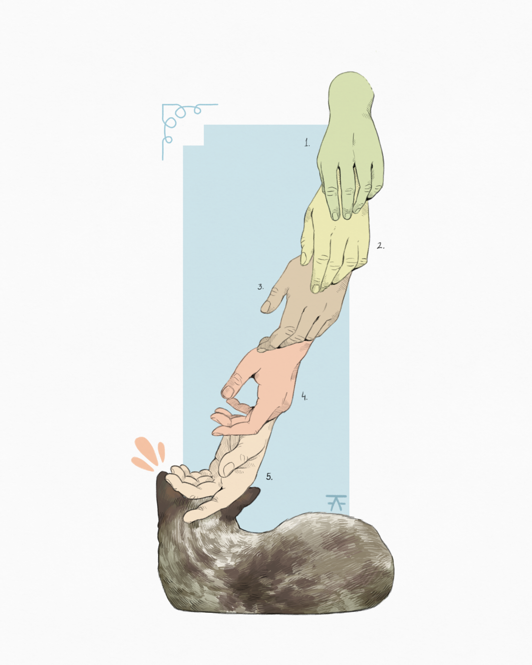 Aproxime-se calmamente. Rode a mão pelo pulso. Estenda os dedos. Gentilmente arraste a parte de trás dos dedos pela superfície do alvo da sua afeição. Repita, caso consentido e tolerado.