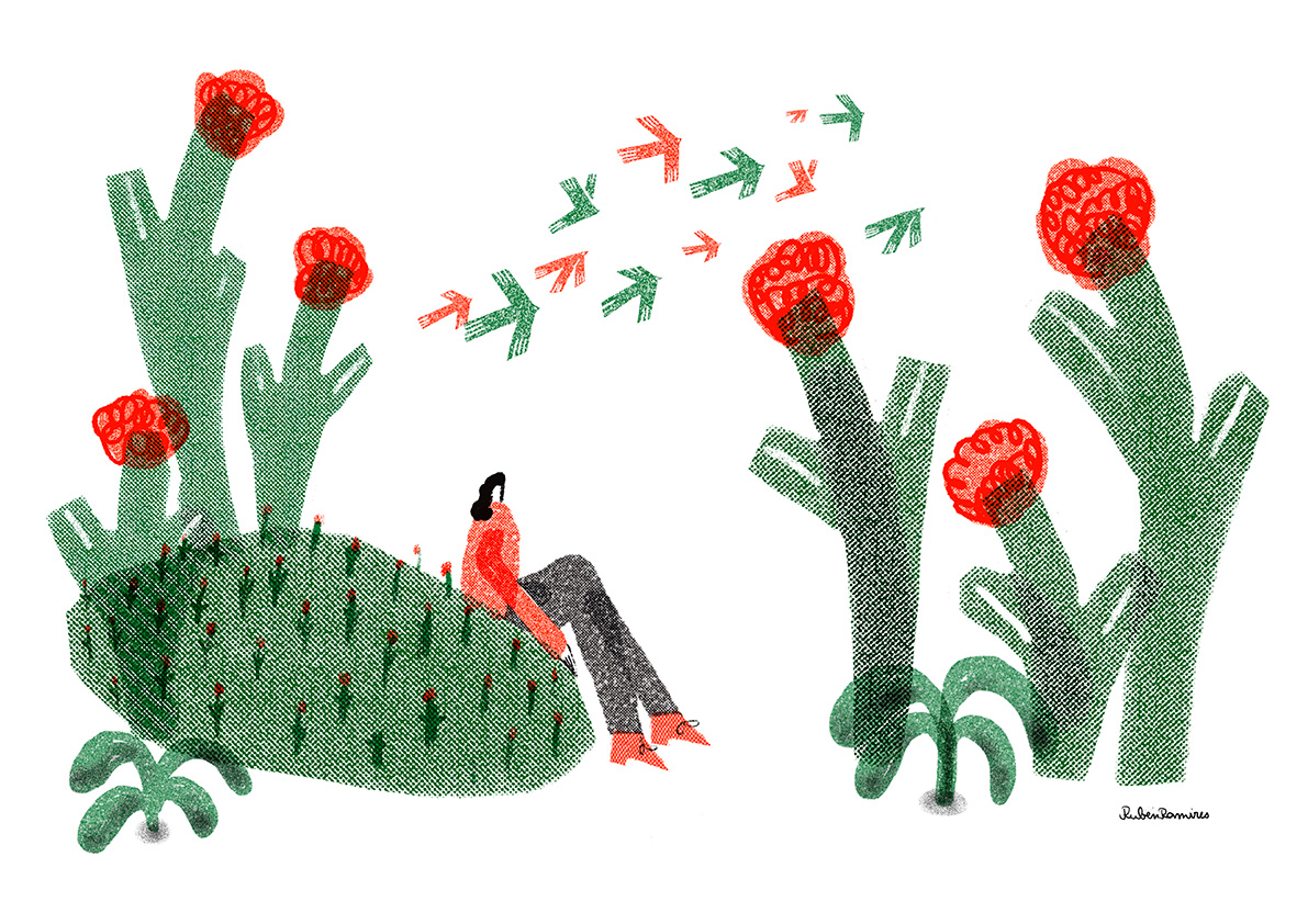 • Ilustração de mulher e plantas verdes com botões vermelhos e setas coloridas