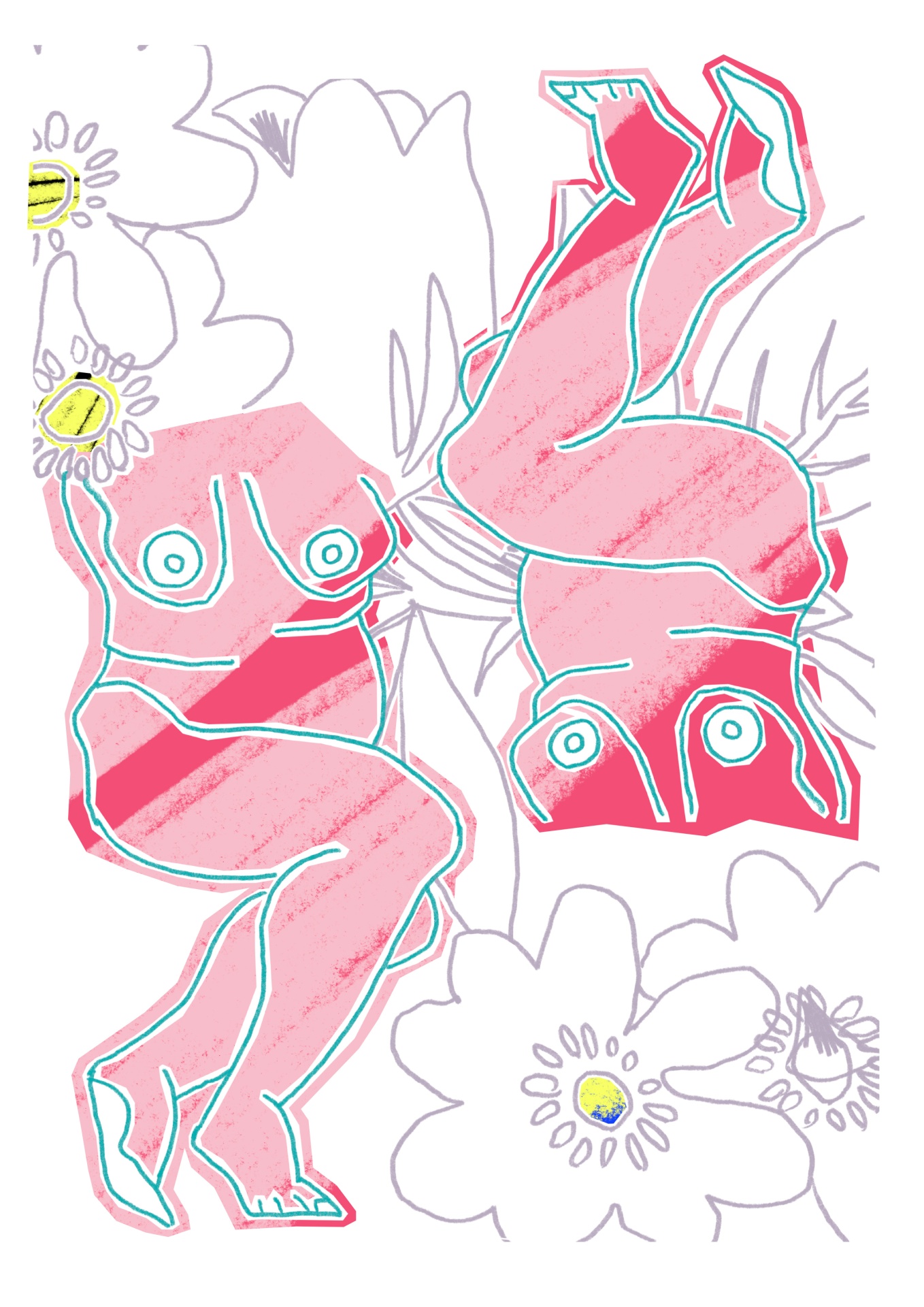 Ilustração de duas figuras femininas em rosa com flores brancas ao fundo