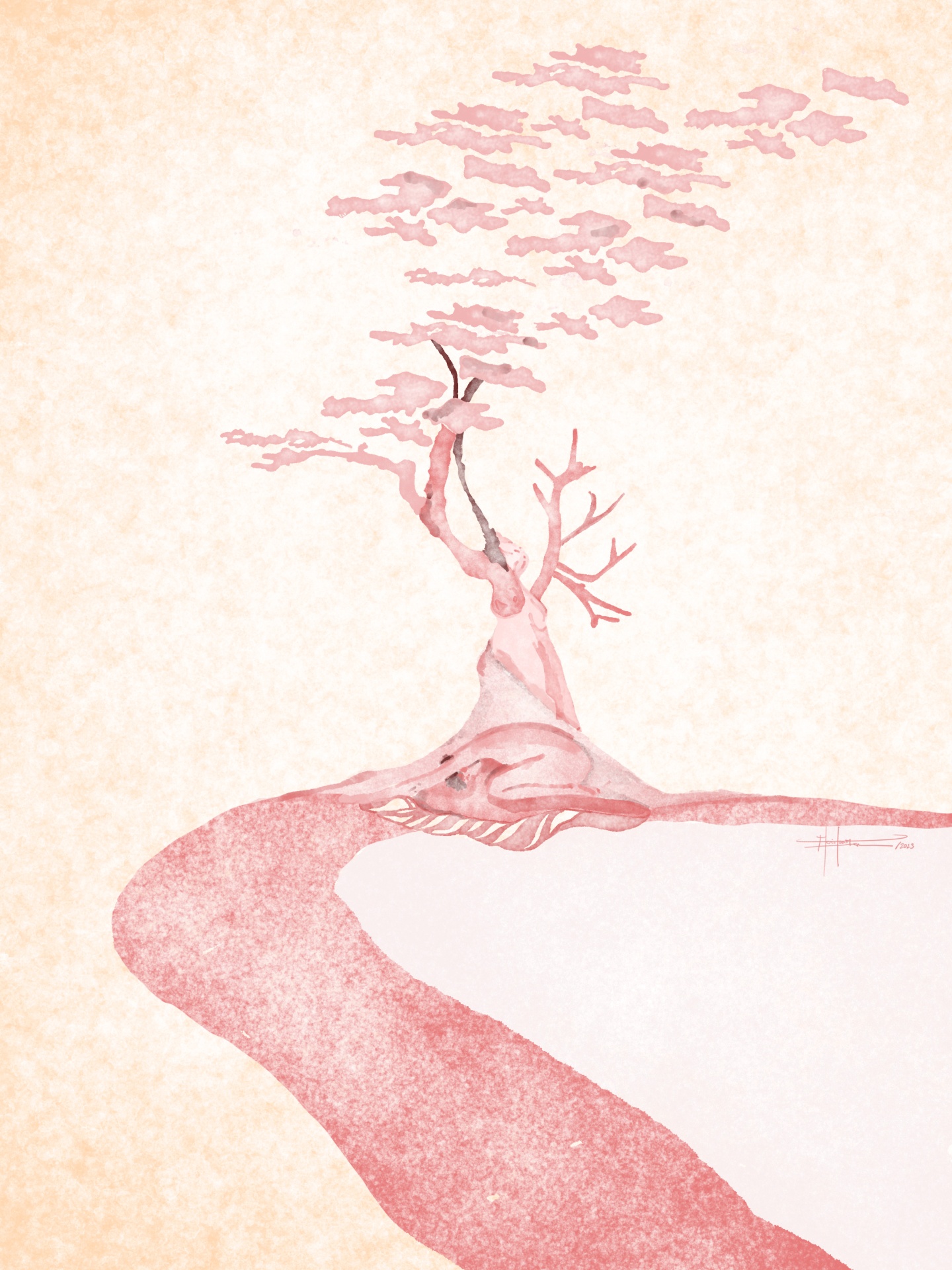 Floresce da terra a mulher, um pilar da nossa existência, que assume a forma de árvore que é um bem essencial à vida. Mulher dona de si. Os tons rosa transmitem calma, amor mas ao mesmo tempo o tempo e sacrifício. É a representação de uma passagem, de um equilíbrio inerente e fundamental à nossa presença.
