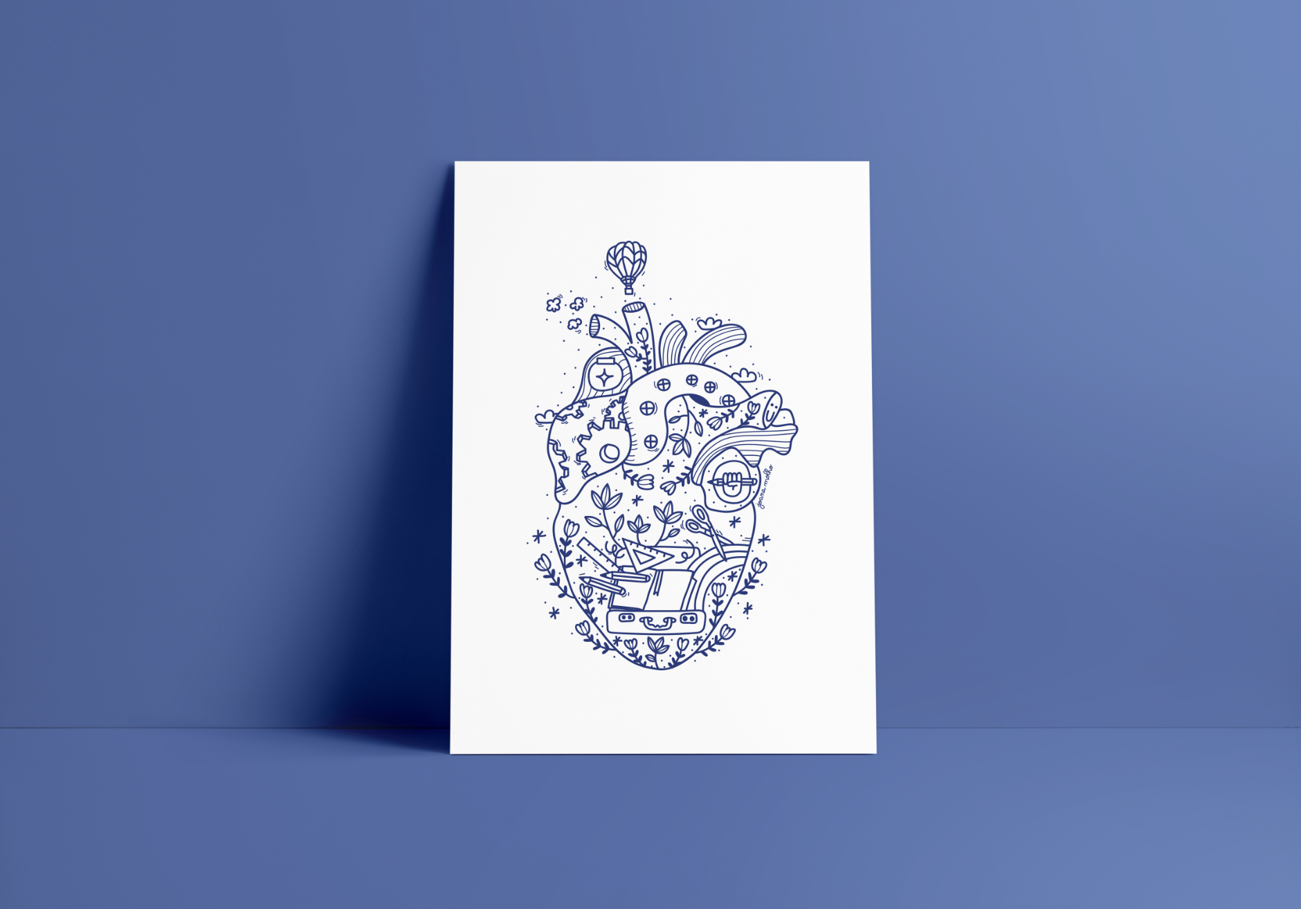 Cartaz branco com ilustração azul escura de um coração anatómico e elementos botânicos encostado a parede azul.