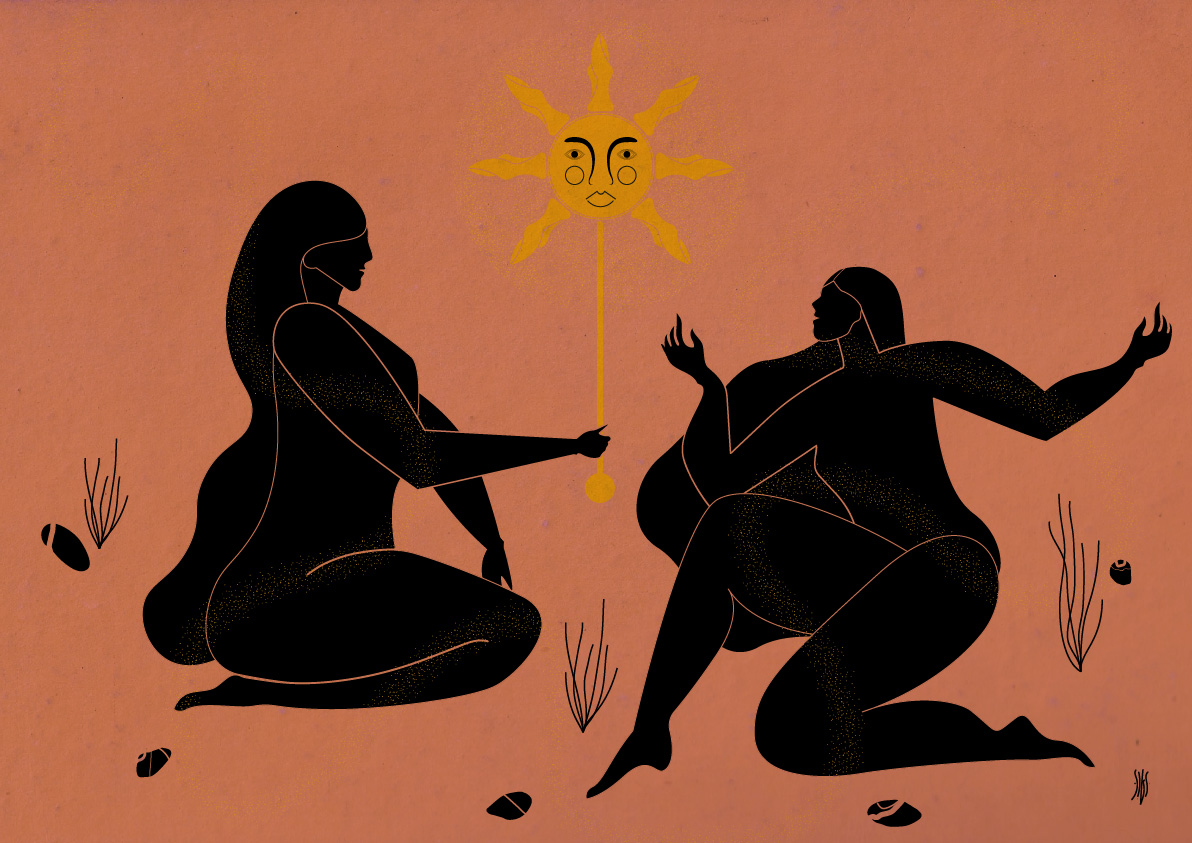 Em resposta ao desafio proposto pela Padaria Águas Furtadas “Corpos de Verão”, criei uma ilustração que aborda a temática dos corpos de verão de uma forma mística e poderosa. Foram representados os corpos voluptuosos de duas mulheres que estão magicamente conectadas com o sol, num ritual de festejo do solstício de verão. A figura feminina nesta ilustração tem o poder sobre o sol e de o fazer brilhar sobre o seu corpo. O registo gráfico escolhido pauta-se pela sintetização das formas e pelo uso limitado da cor como forma de dar destaque às curvas dos corpos femininos. Com os efeitos como o ruído e algumas texturas pretende-se dar alguma tridimensionalidade e dinamismo à composição.