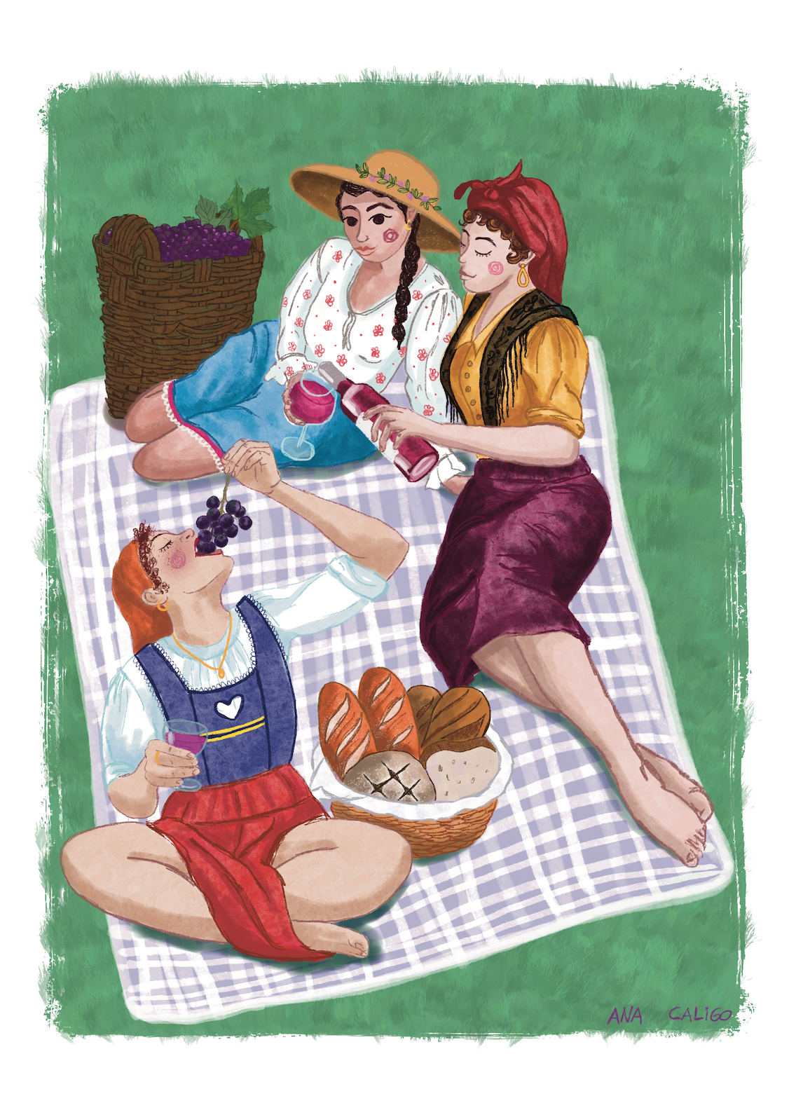 • Três mulheres com roupas tradicionais a fazer um piquenique em campo verde sobre manta xadrez, com pão e uvas.