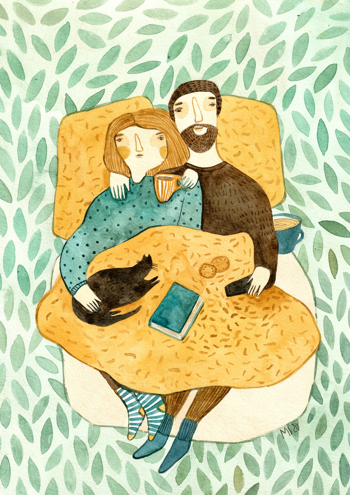 • Ilustração de casal no sofá com manta amarela, gato preto, livro azul e chávena de chá, fundo de folhas verdes