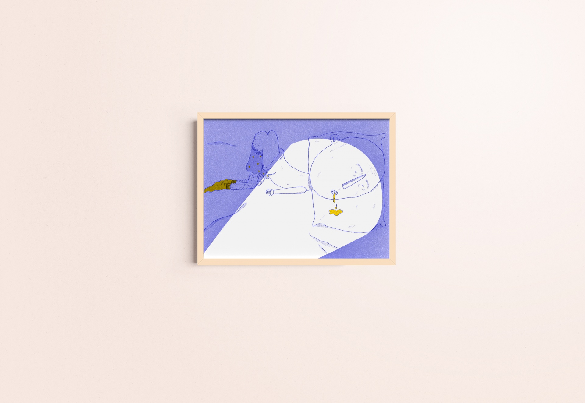 • Quadro emoldurado com figuras humanas em azul, branco e amarelo
