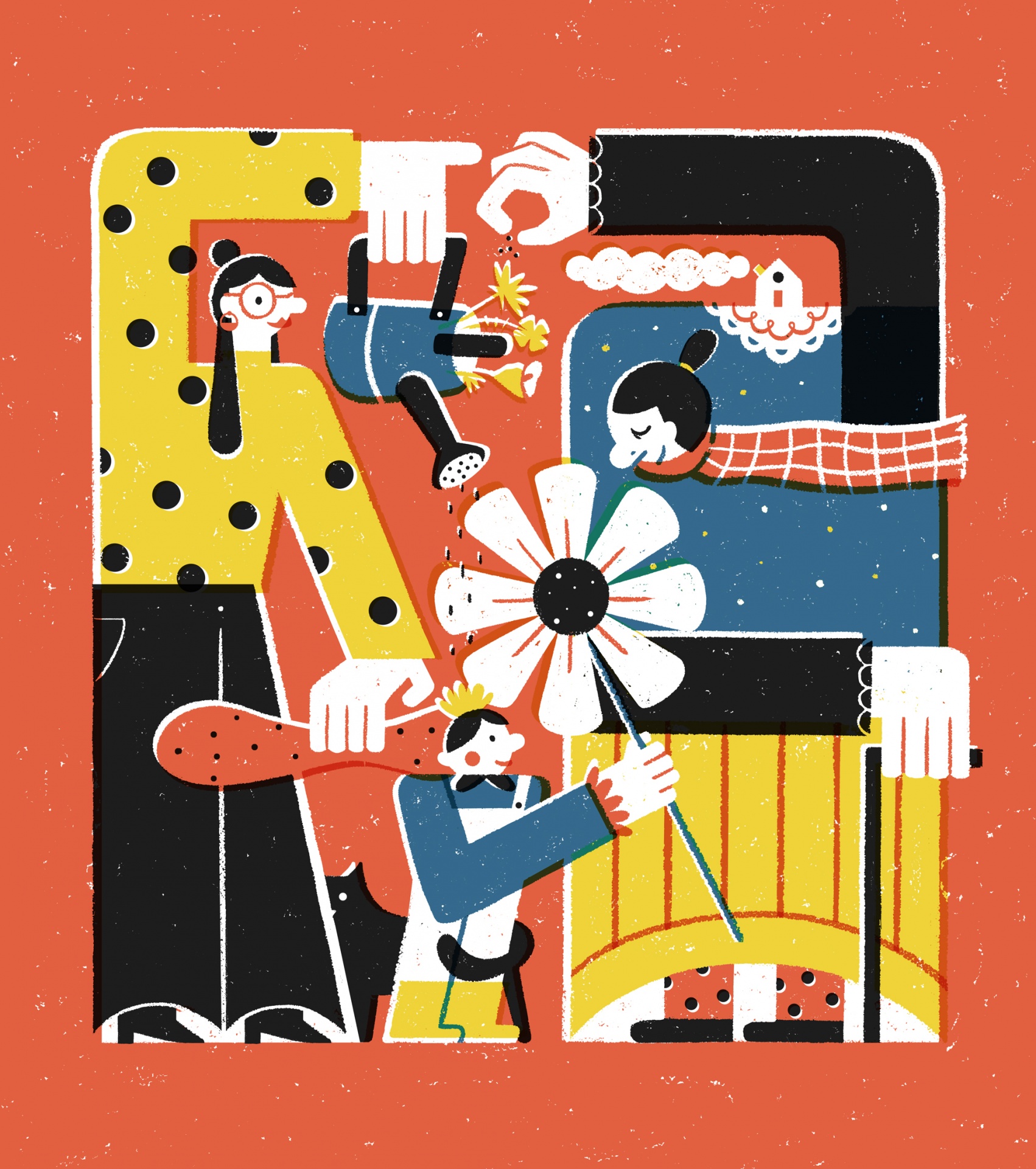 • Ilustração com quatro figuras geométricas coloridas segurando uma flor grande