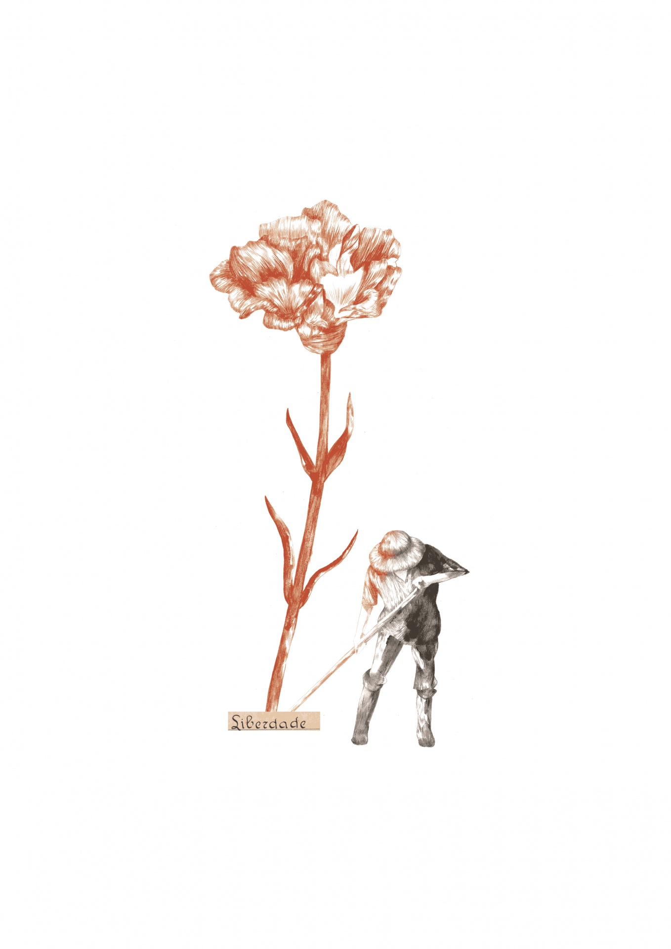 • Desenho de flor carnuda castanha com figura humana e palavra Liberdade.