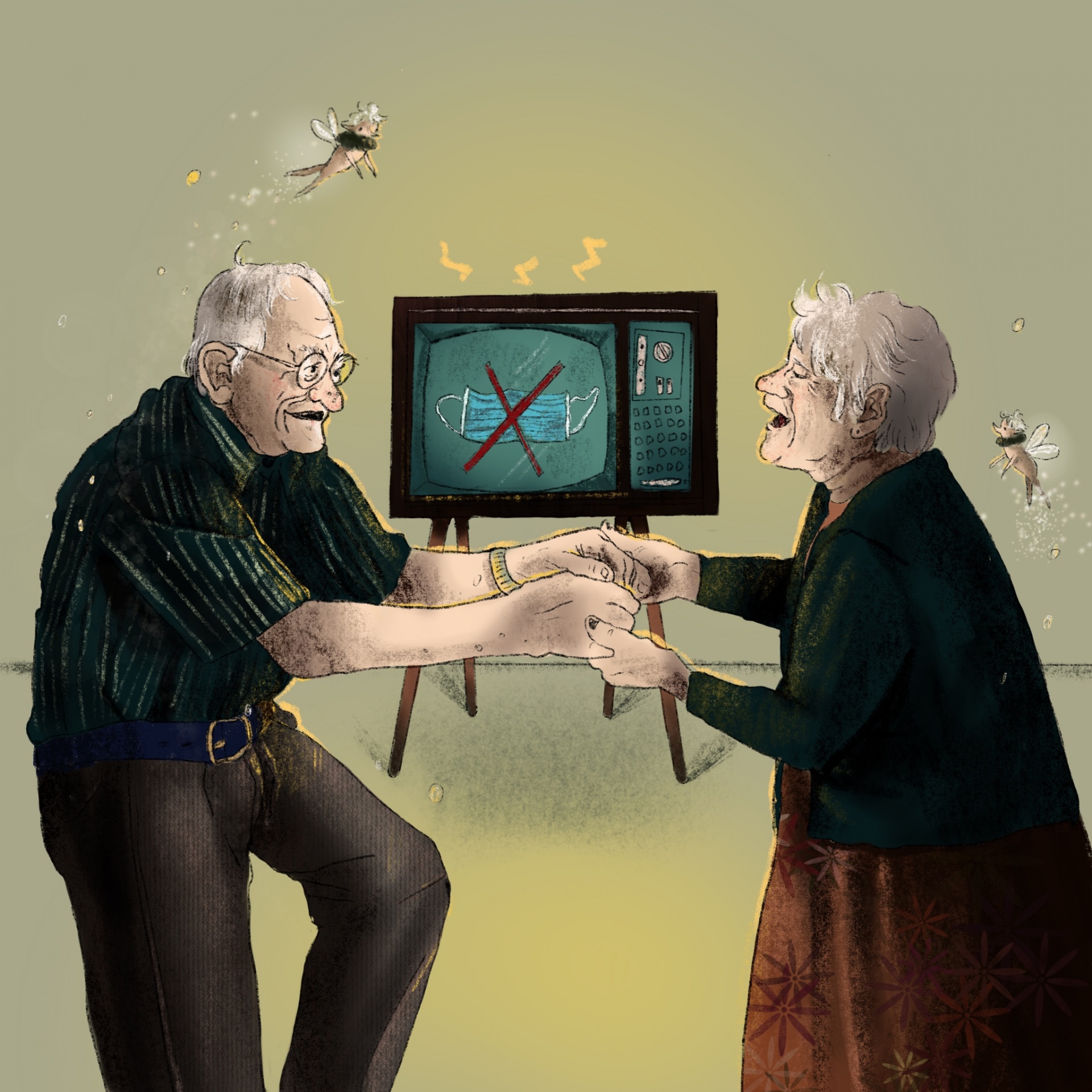 • Casal idoso dançando com televisão antiga ao fundo e fadas ao redor