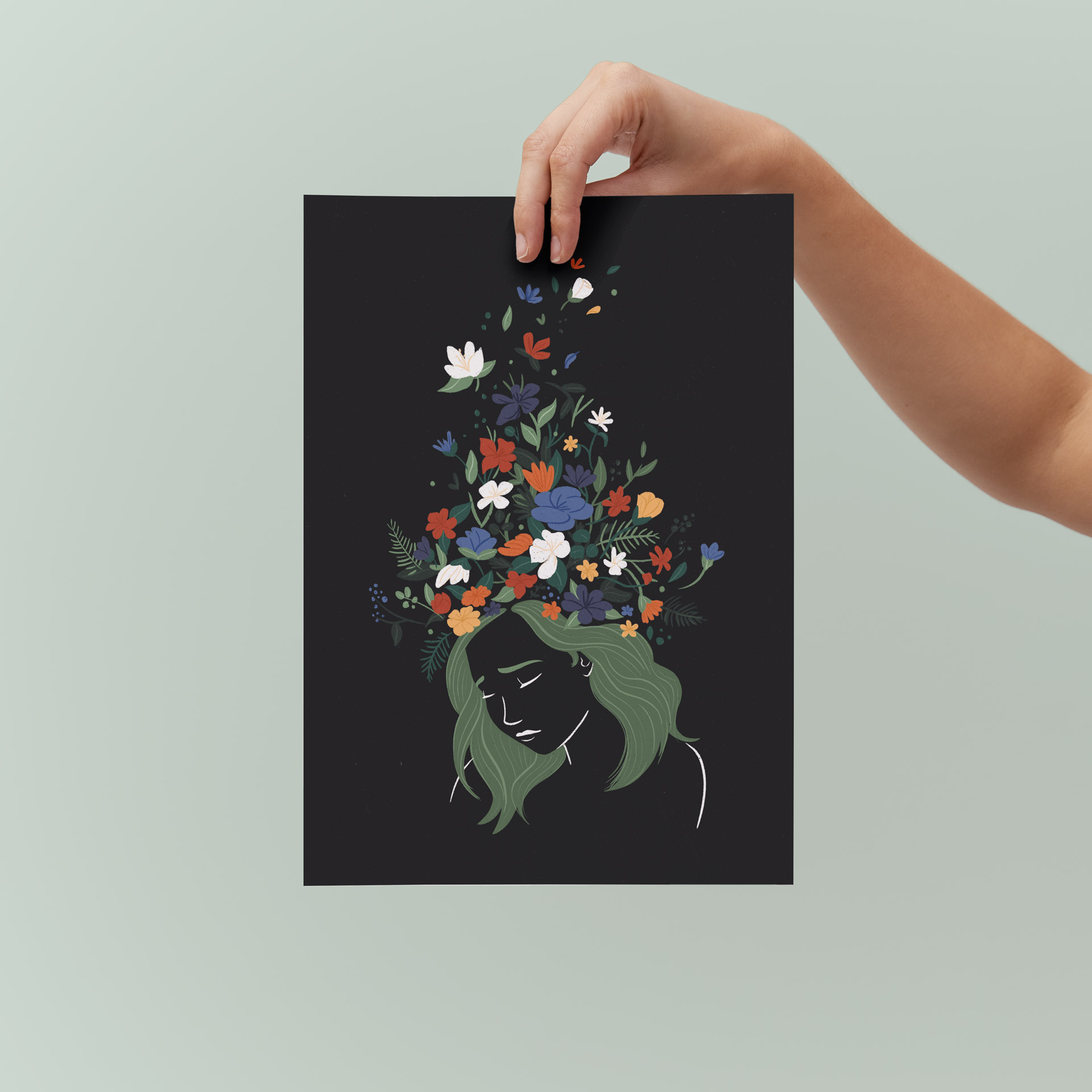 • Ilustração de mulher com flores coloridas na cabeça em cartaz com fundo preto