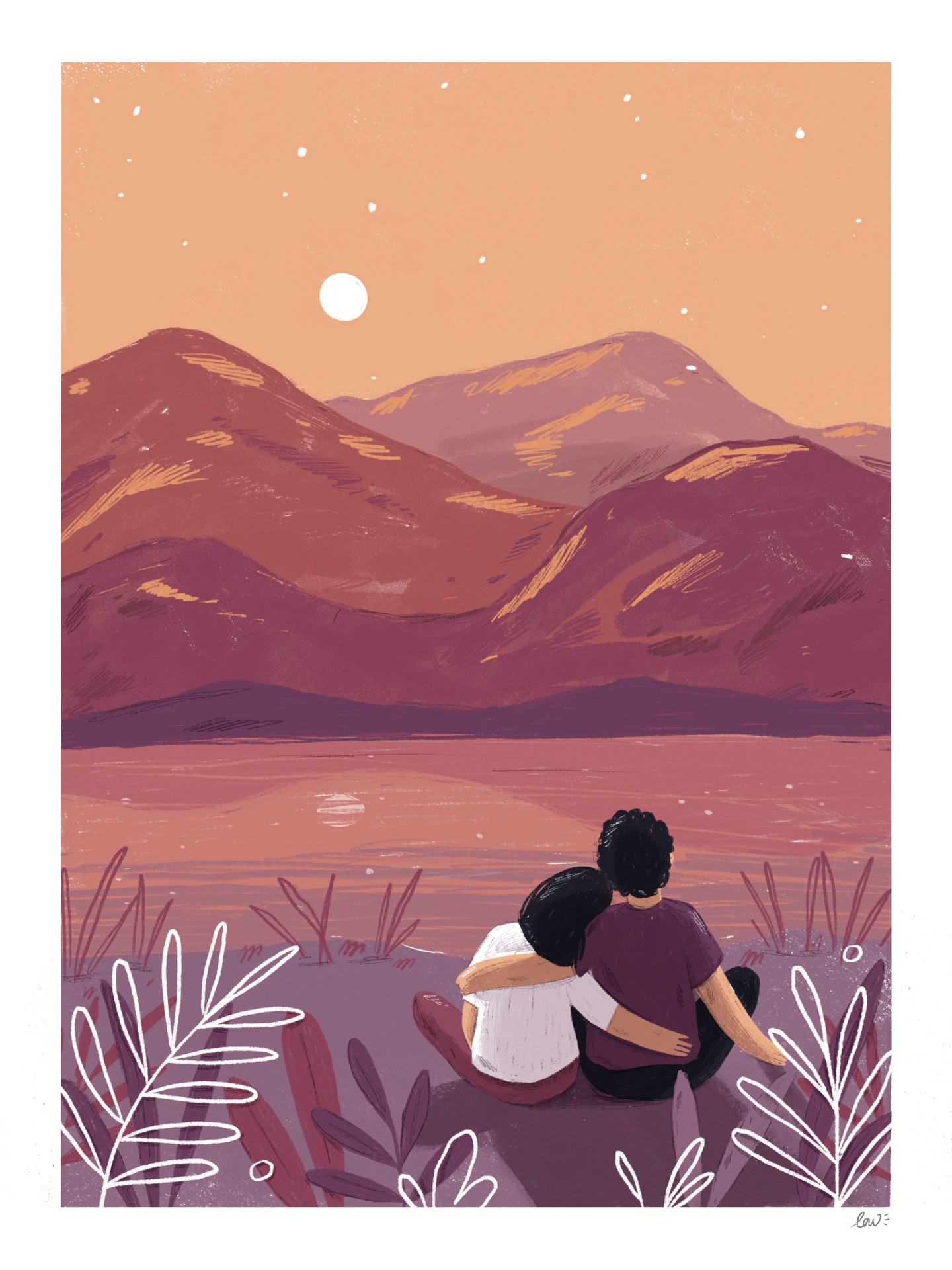 • Casal sentado junto a um lago ao pôr do sol com montanhas ao fundo e plantas desenhadas em primeiro plano