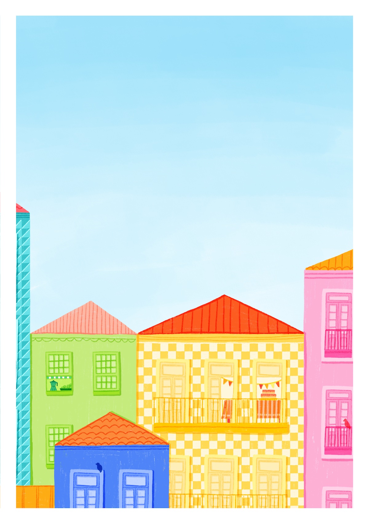 • Ilustração colorida de edifícios tradicionais contra o céu azul.