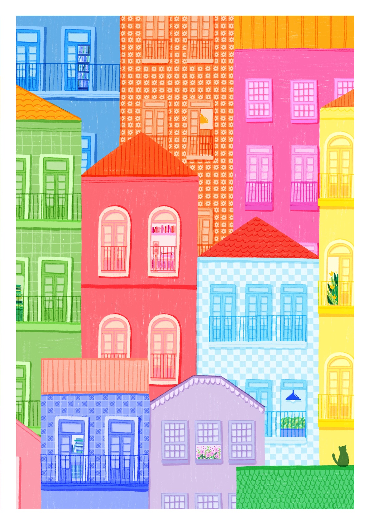 • Ilustração de prédios coloridos com janelas e varandas