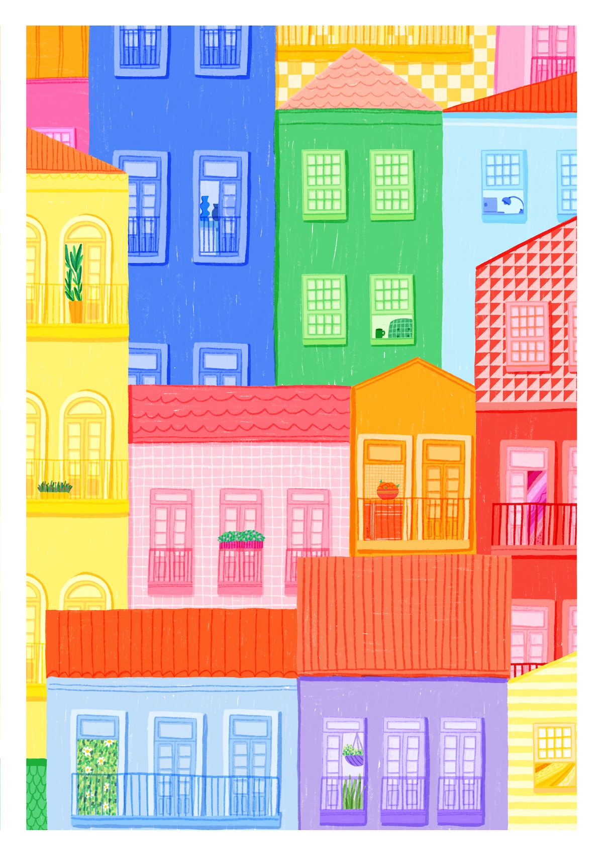 • Ilustração colorida de fachadas de casas com janelas e varandas