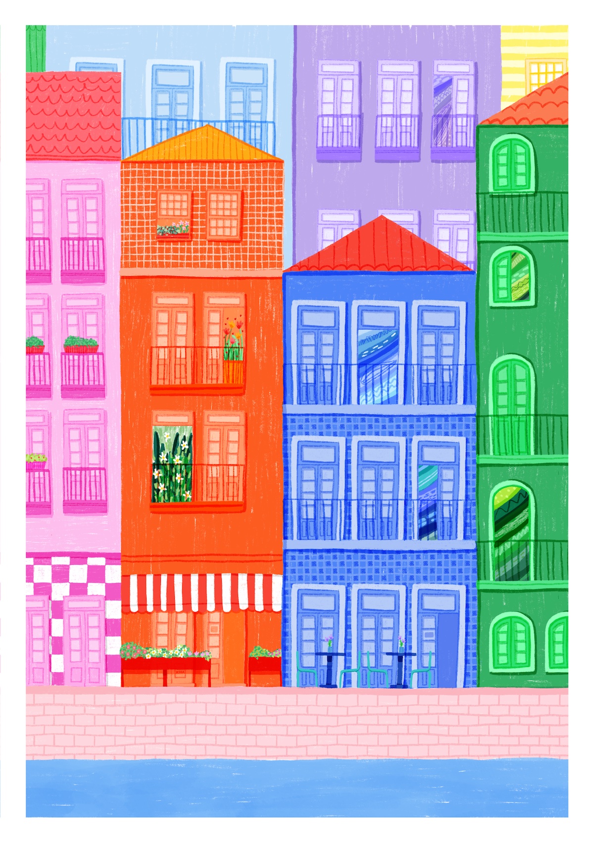 • Ilustração colorida de prédios e varandas ao lado de um rio