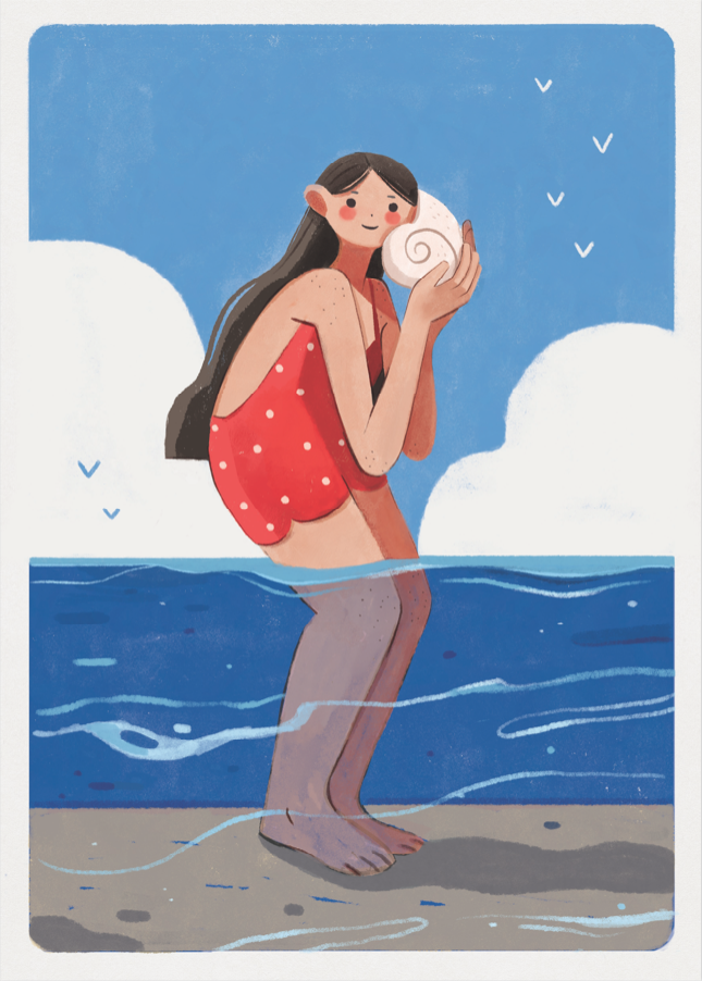 Ilustração de rapariga na praia com fato de banho vermelho e concha na mão