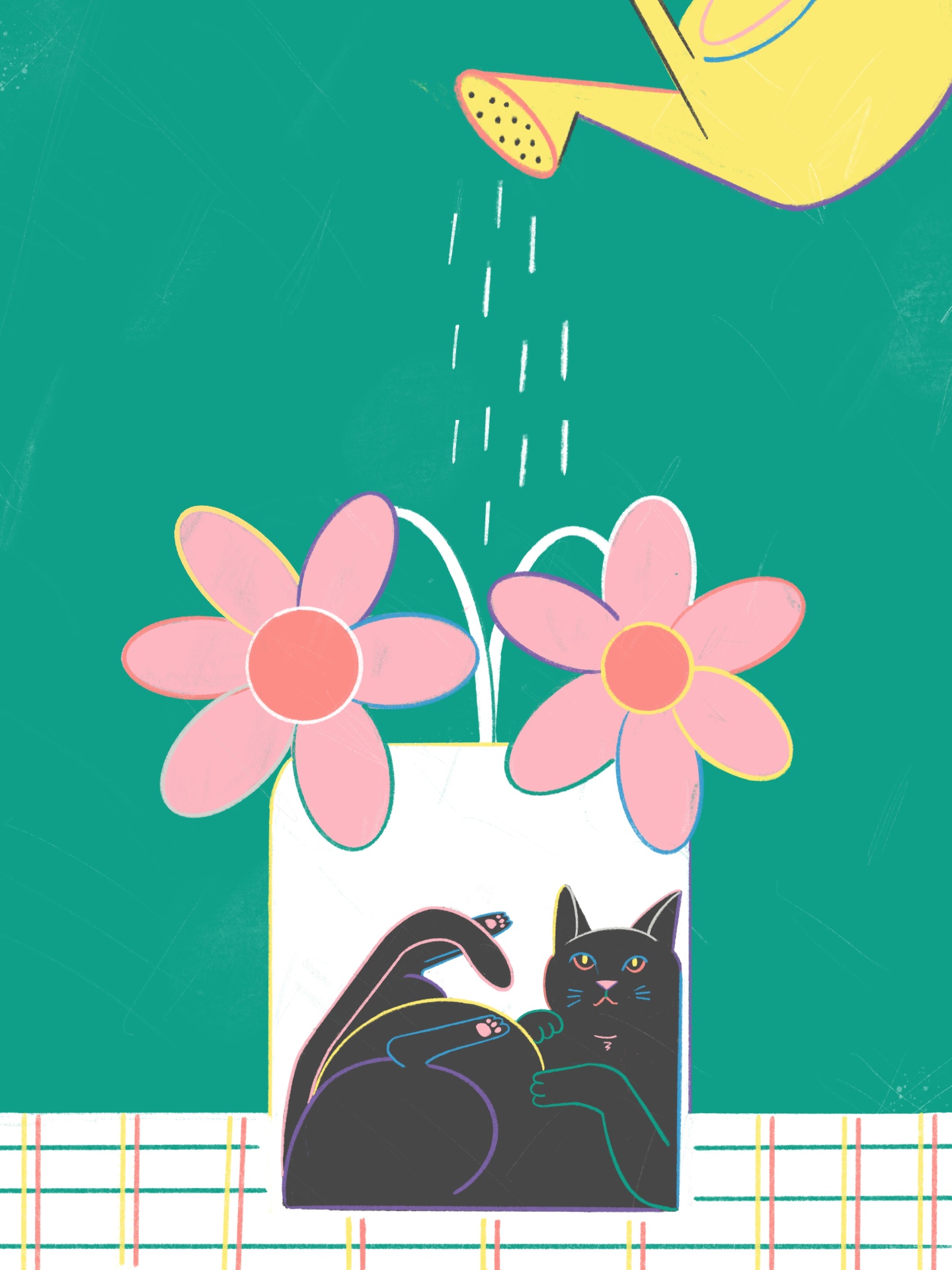 • Saco branco com flores cor-de-rosa e desenho de gato preto, regador amarelo a dar água, fundo verde