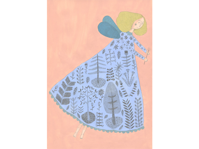 • Ilustração de anjo com vestido azul e asas azuis sobre fundo rosa