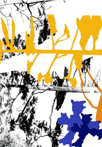 • Composição abstrata com formas em amarelo, azul e preto sobre fundo branco com texturas que lembram galhos