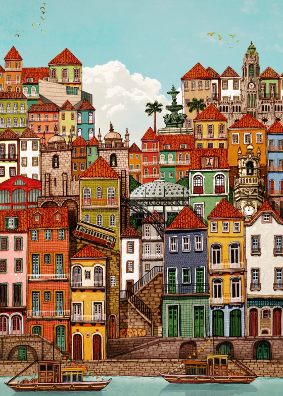 • Pintura colorida de cidade ribeirinha com casas antigas e barcos na água