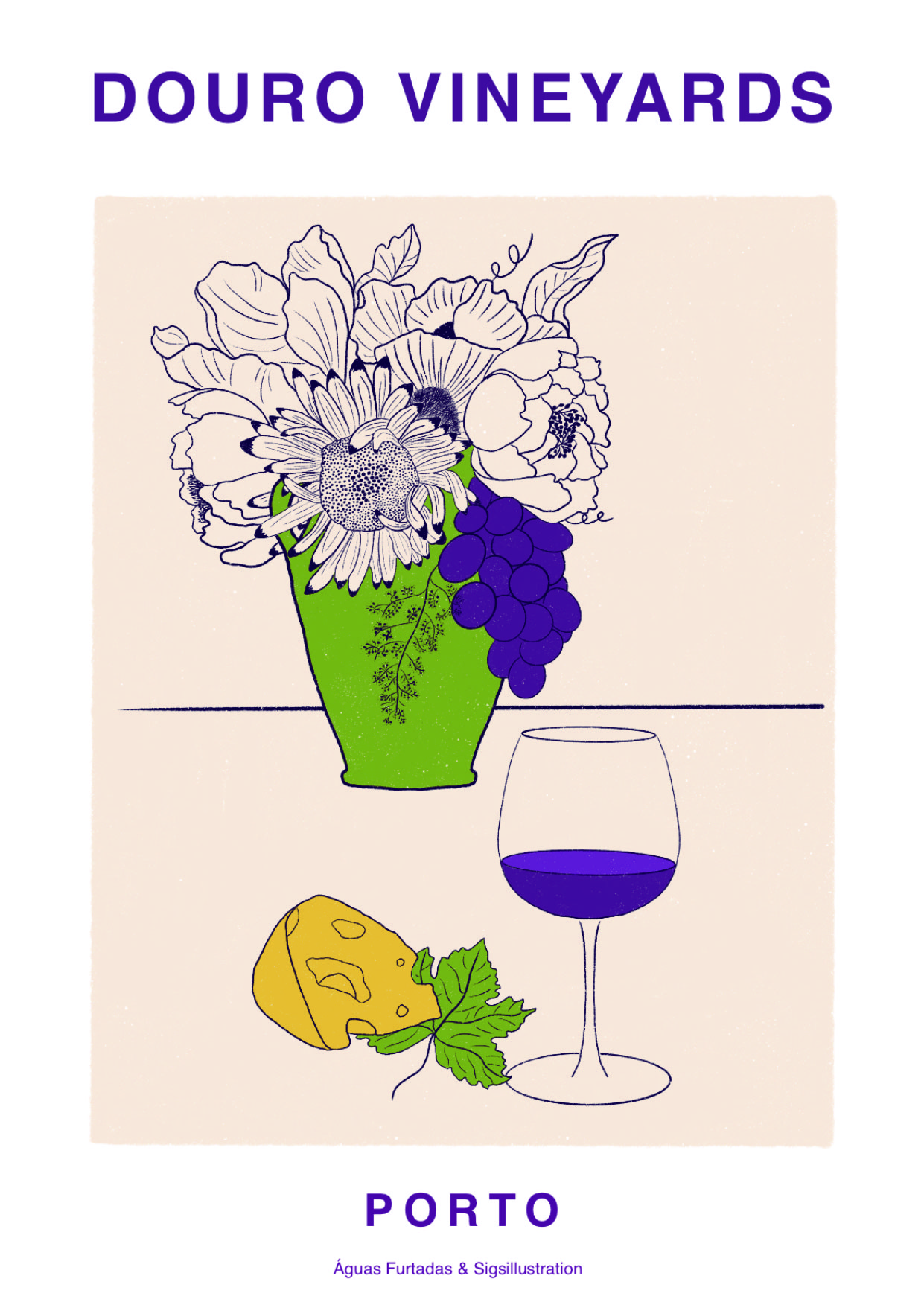 • Ilustração de vaso com flores, uvas, copo de vinho e queijo com texto Douro Vineyards e Porto.
