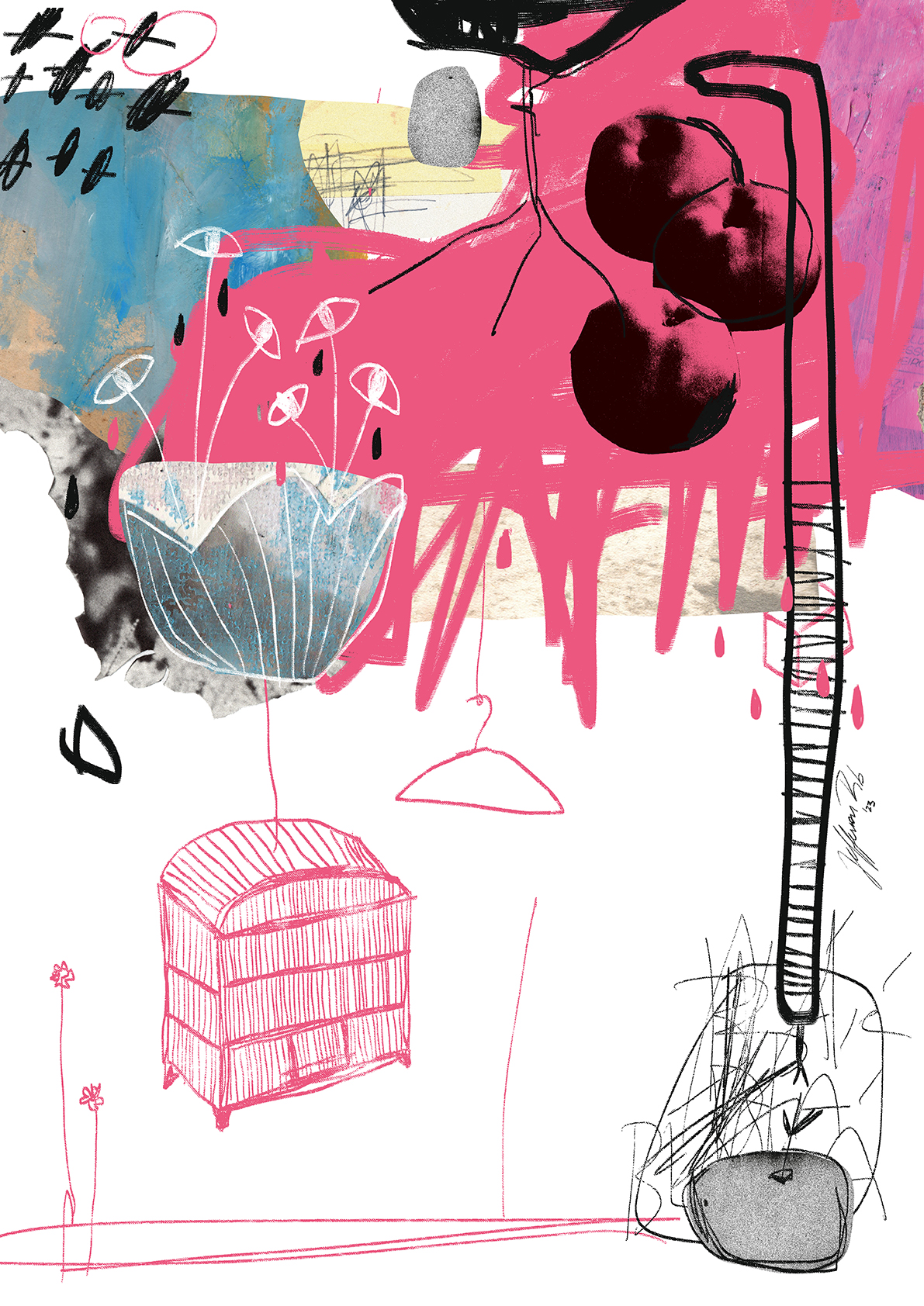 Ilustração abstrata colorida com elementos florais e formas desenhadas à mão.