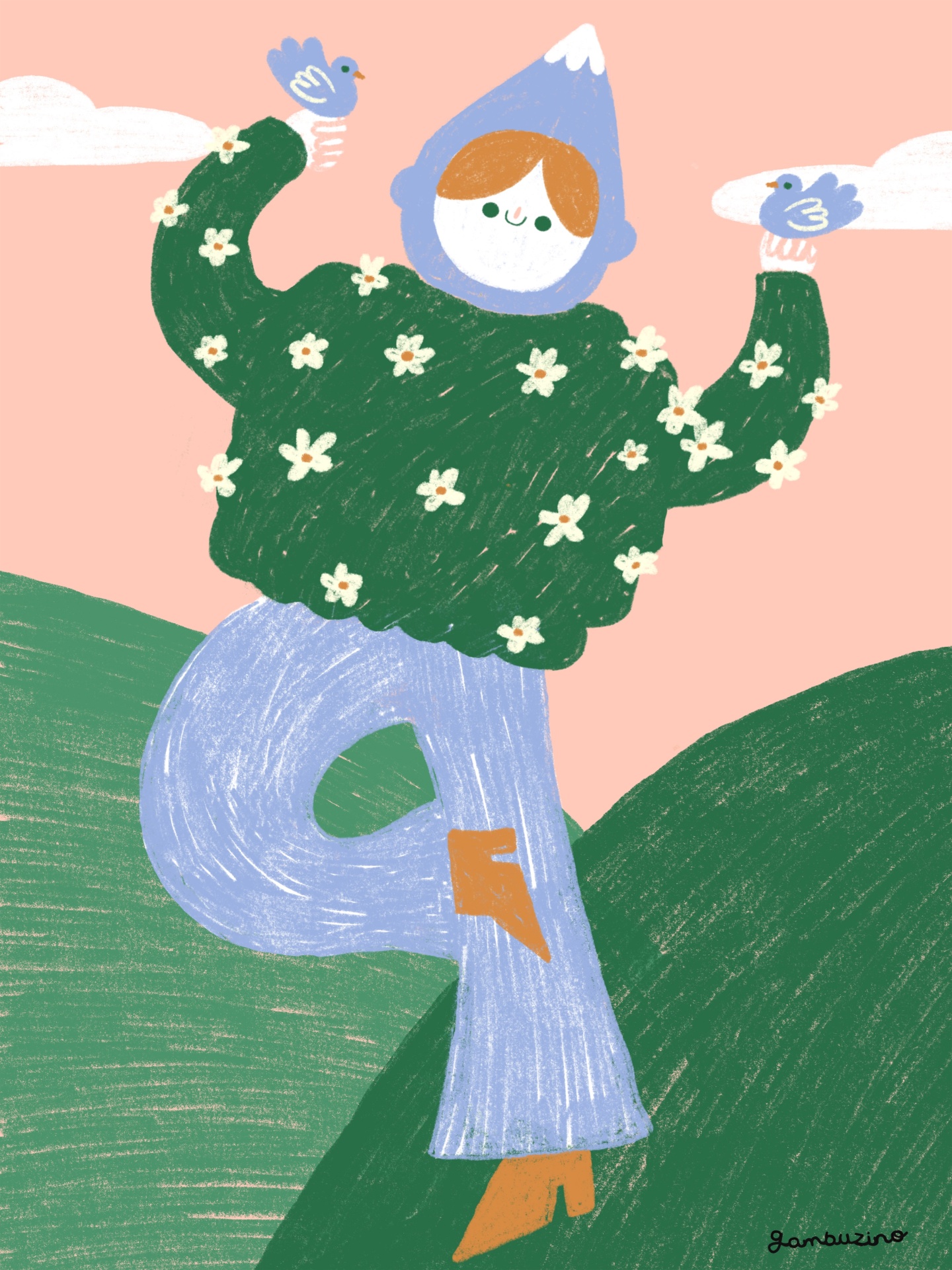 Ilustração de figura humana com casaco verde florido e chapéu azul segurando pássaros