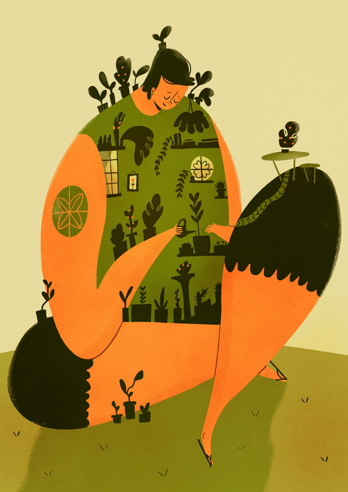 • Ilustração de figura humana com plantas e tatuagens em fundo verde claro