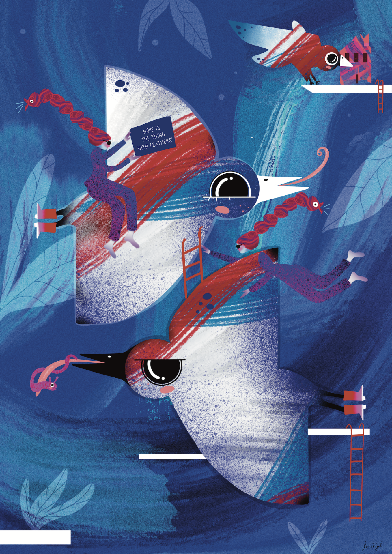 A ilustração chama-se 'Emily' baseado num poema de Emily Dickinson chamado “Hope” is the thing with feathers'. O poema fala de esperança e resiliência. A metáfora central do poema compara a esperança a um pássaro (“Hope” is the thing with feathers) que pousa na alma e canta uma melodia sem palavras. Esta imagem evoca uma sensação de leveza, liberdade e resiliência, sugerindo que a esperança pode elevar e confortar os indivíduos mesmo nos tempos mais sombrios. A ilustração viaja através das asas dos pássaros das suas texturas e das suas personagens.