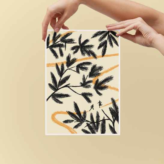 • Impressão em papel com padrão de folhas pretas e linhas laranja sendo segurada por mãos