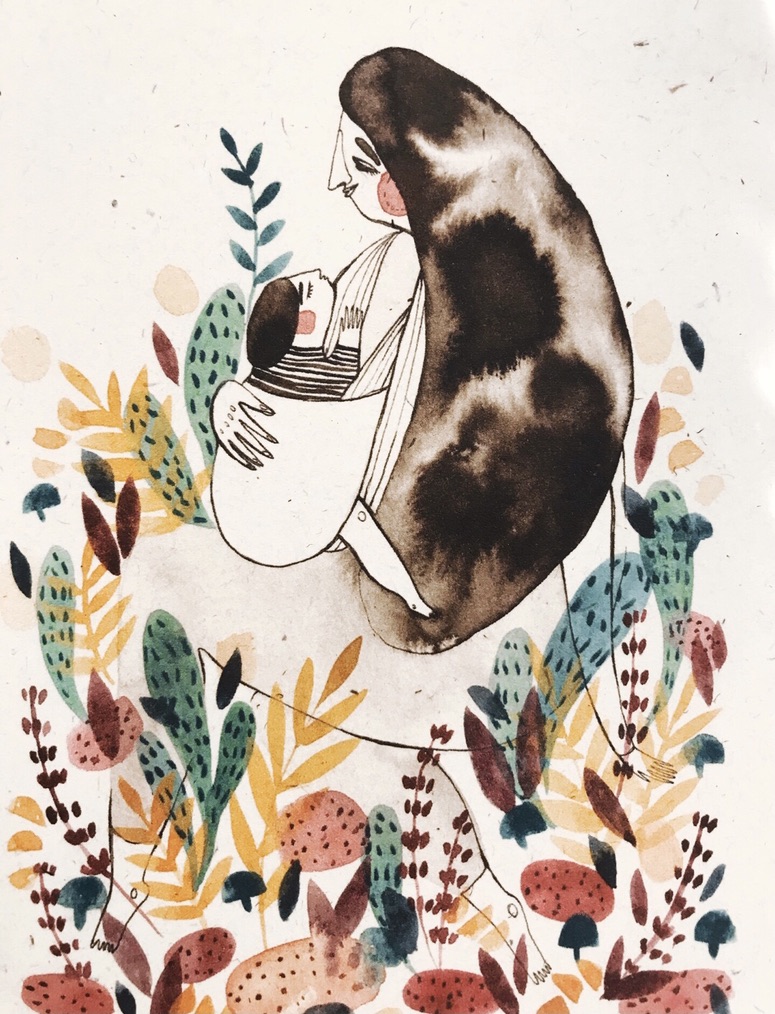 Ilustração de mulher e bebé rodeados por plantas coloridas