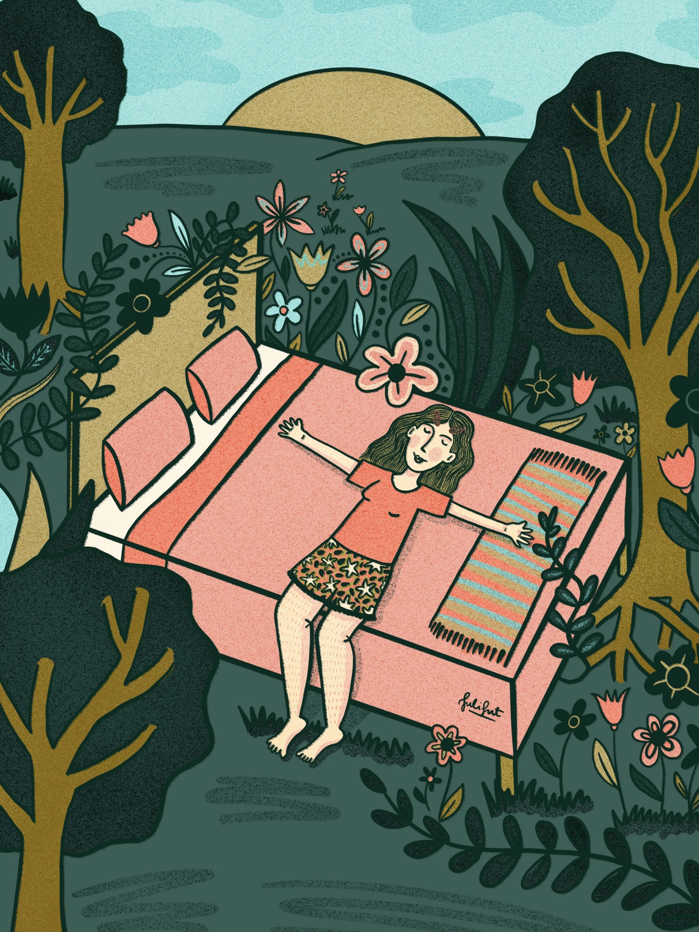 Ilustração de cama de casal rosa com rapariga deitada no exterior, rodeada de flores e plantas ao pôr do sol
