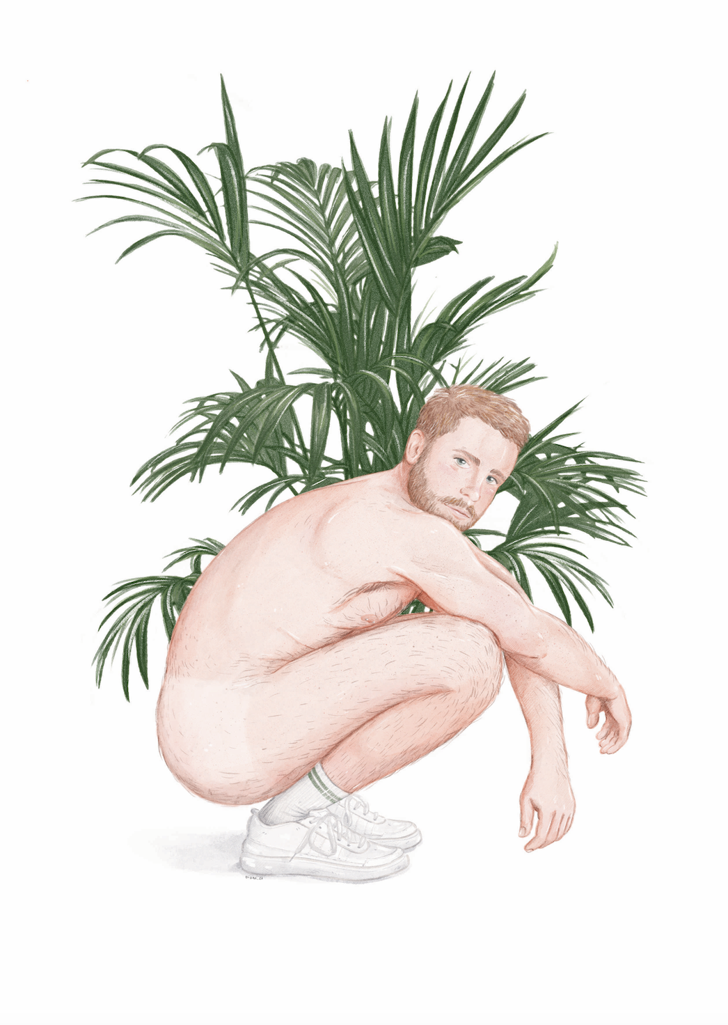 • Homem agachado nu com meias e sapatilhas brancas diante de plantas verdes