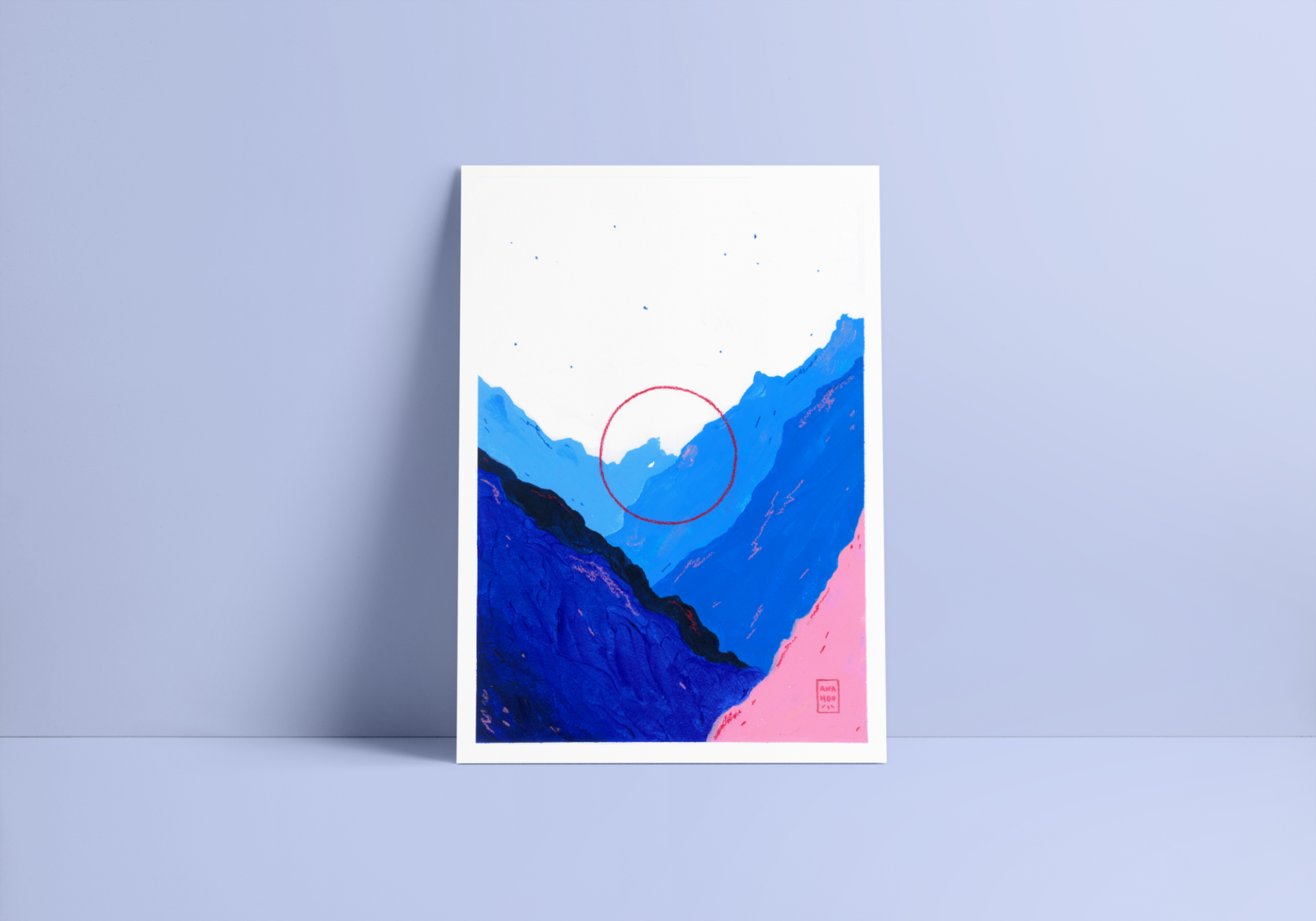 • Poster abstrato azul e rosa com círculo vermelho e pontos azuis