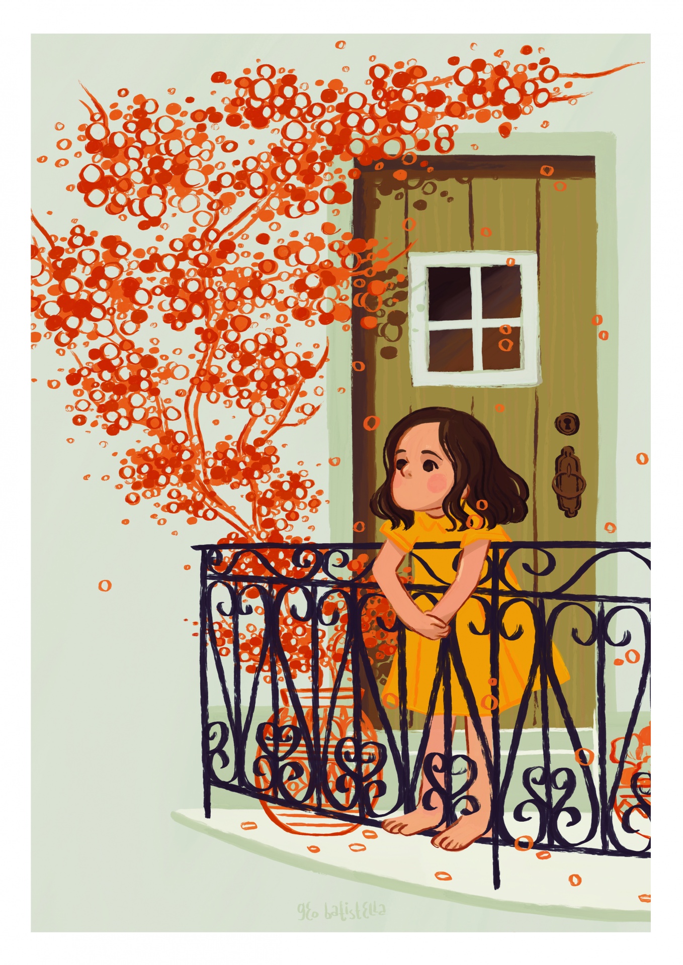 • Criança de vestido amarelo numa varanda com porta verde e flores vermelhas