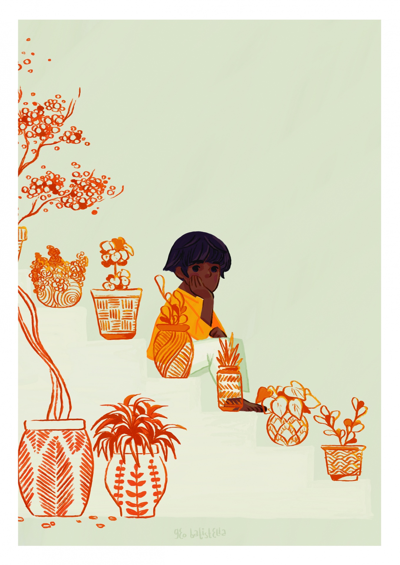 • Ilustração de criança sentada em escada rodeada por vasos de plantas em tons laranja e amarelo