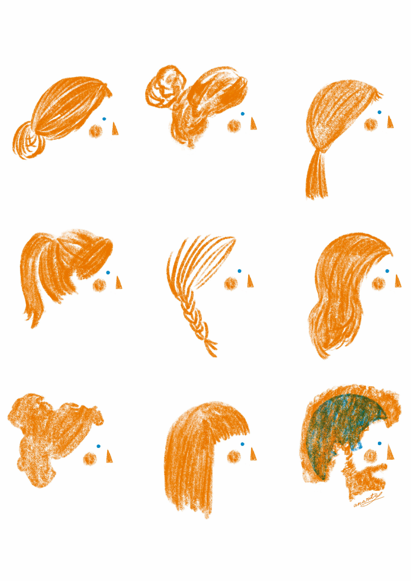 Nove desenhos de rostos de perfil com cabelo laranja em diferentes estilos sobre fundo branco