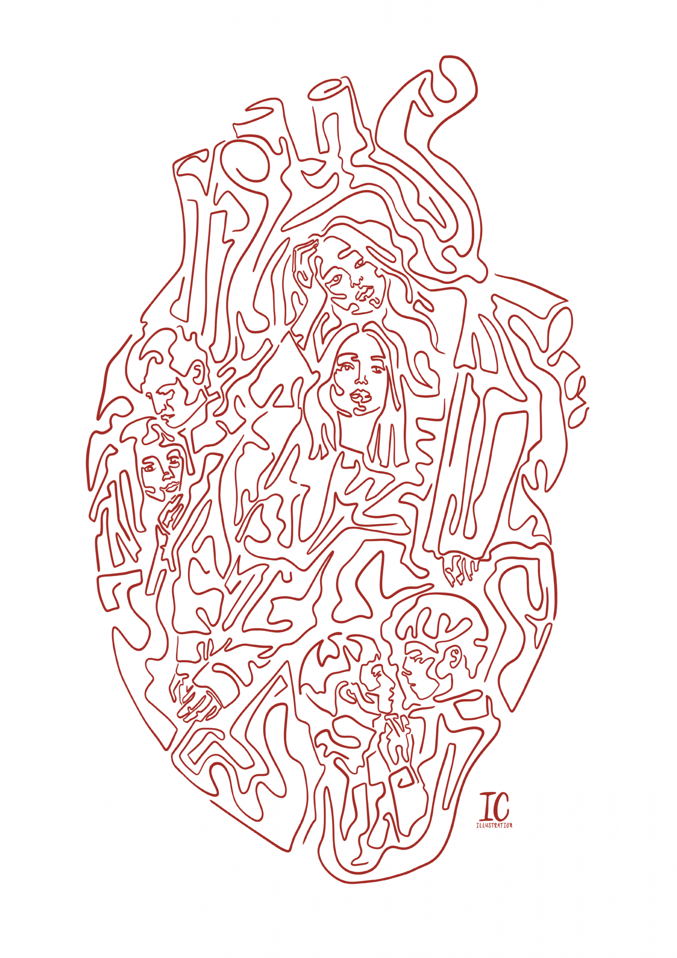 • Desenho em linha vermelha de um coração humano com rostos humanos integrados
