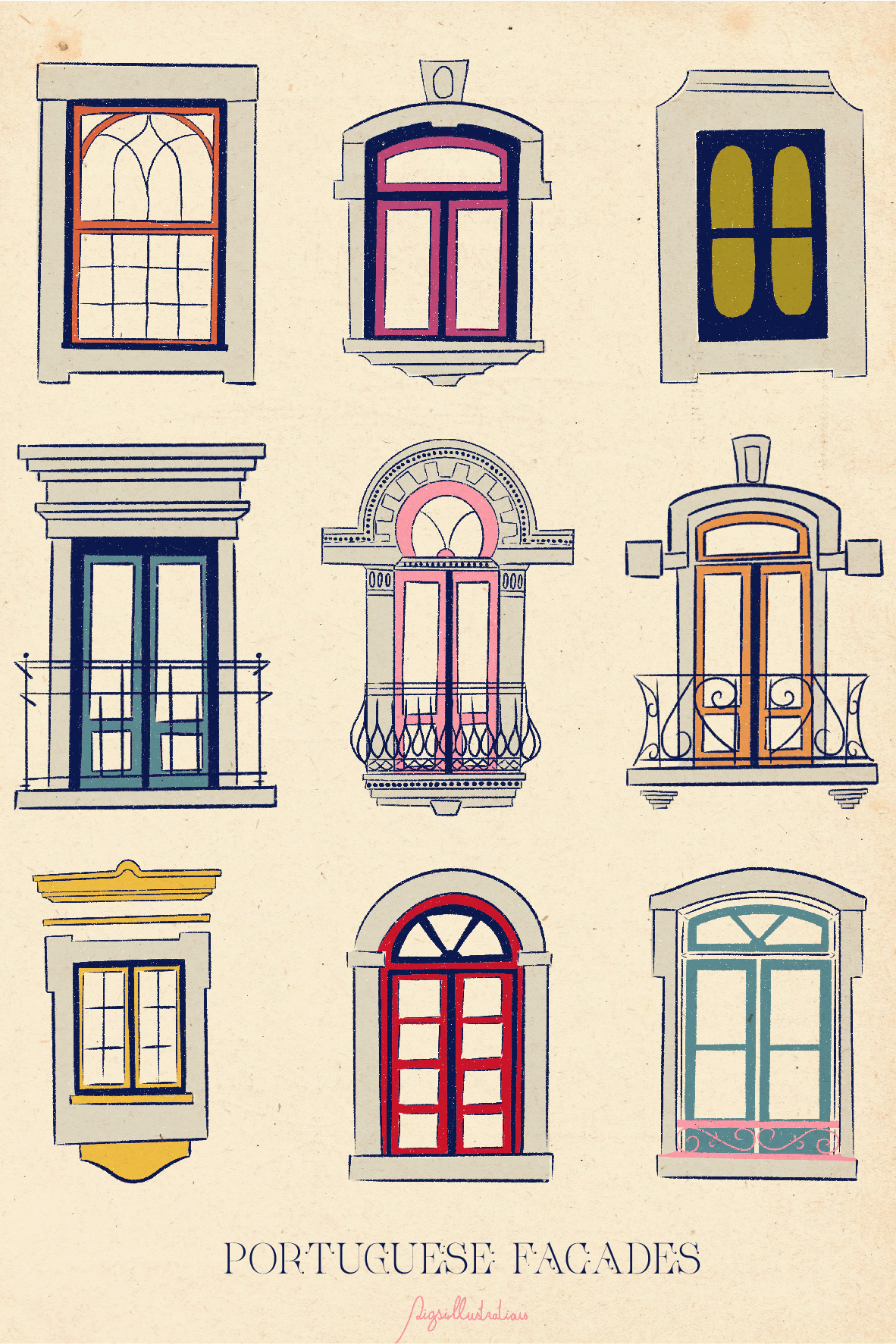 • Ilustração de nove janelas de fachadas portuguesas coloridas e decoradas