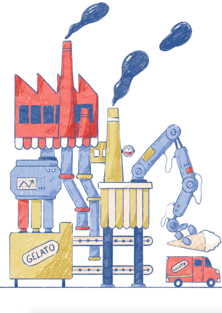 • Ilustração de fábrica de gelados com chaminés, braços mecânicos e camião.