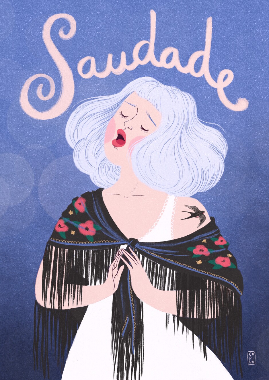 • Desenho de mulher de cabelo branco a cantar com xale preto com flores e palavra Saudade no fundo azul