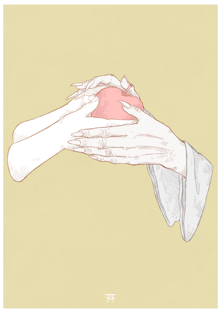 Ilustração de duas mãos segurando uma maçã vermelha num fundo bege