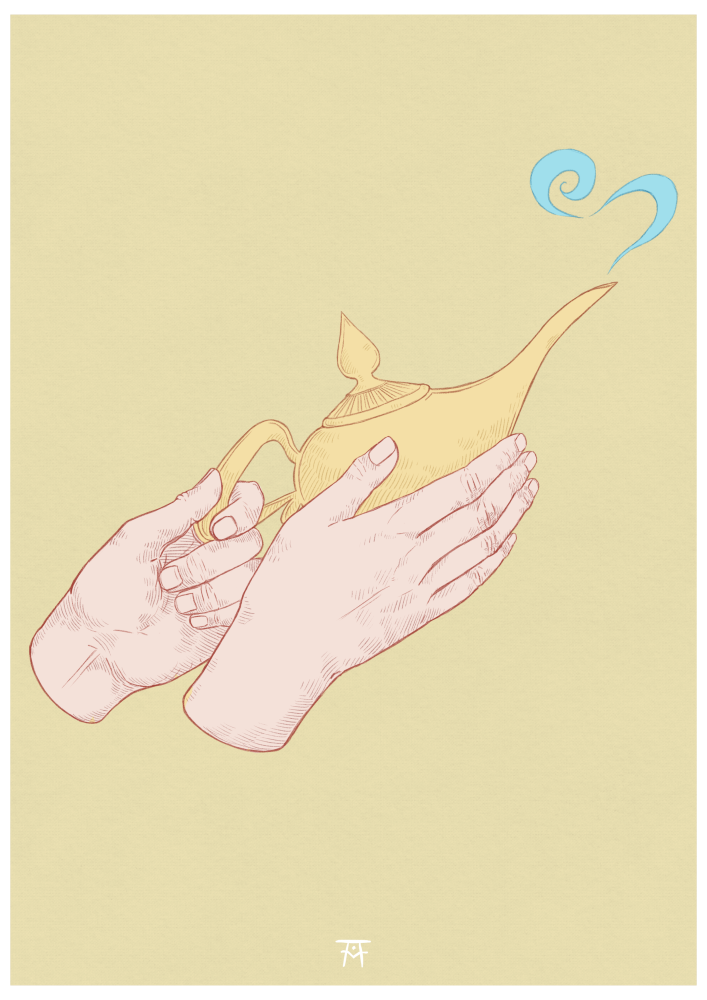 Desenho de mãos segurando uma lâmpada dourada de Aladino com fundo bege